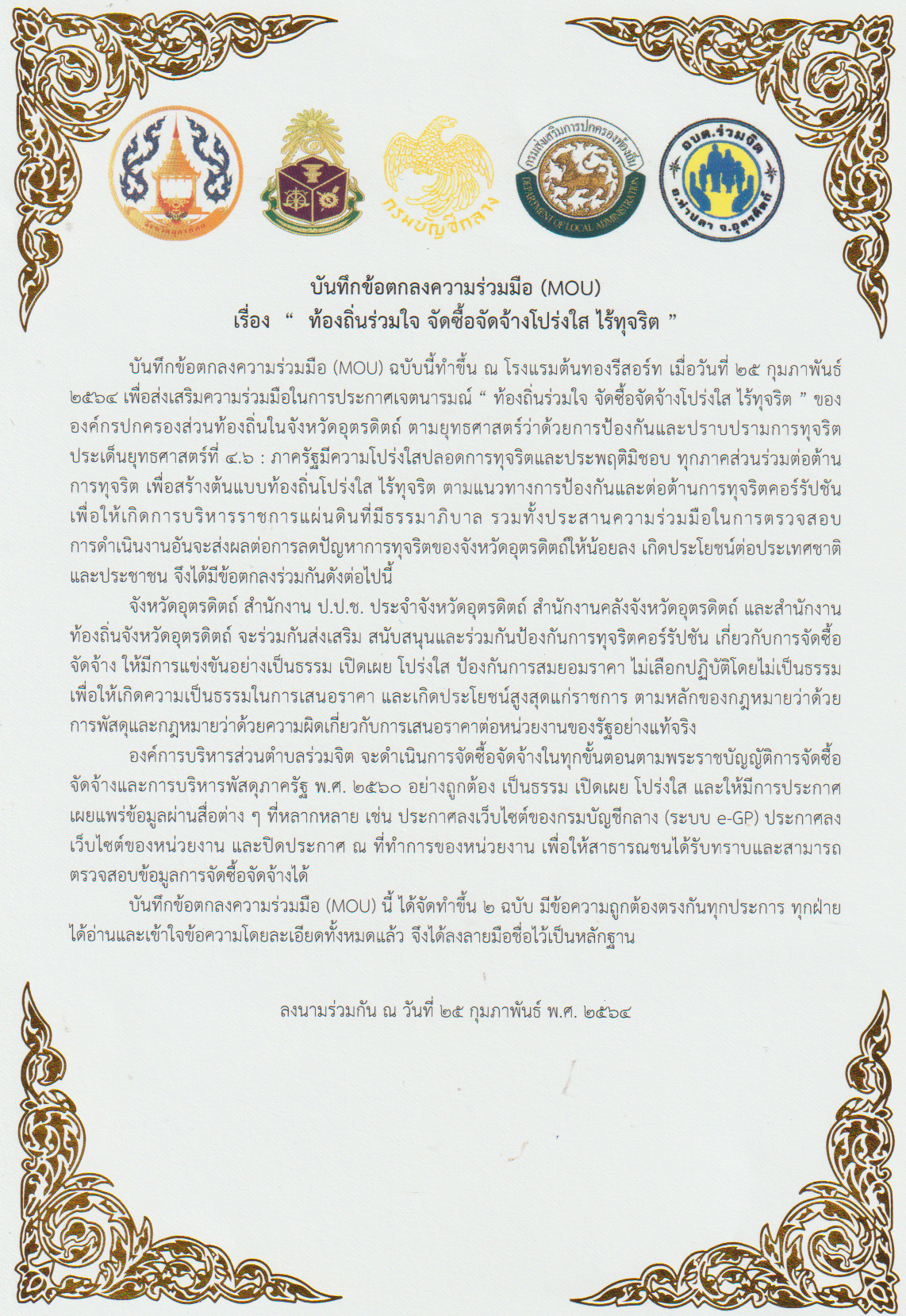 บันทึกข้อตกลงความร่วมมือ MOU เรื่อง ท้องถิ่นร่วมใจ จัดซื้อจัดจ้างโปร่งใส ไร้ทุจริต